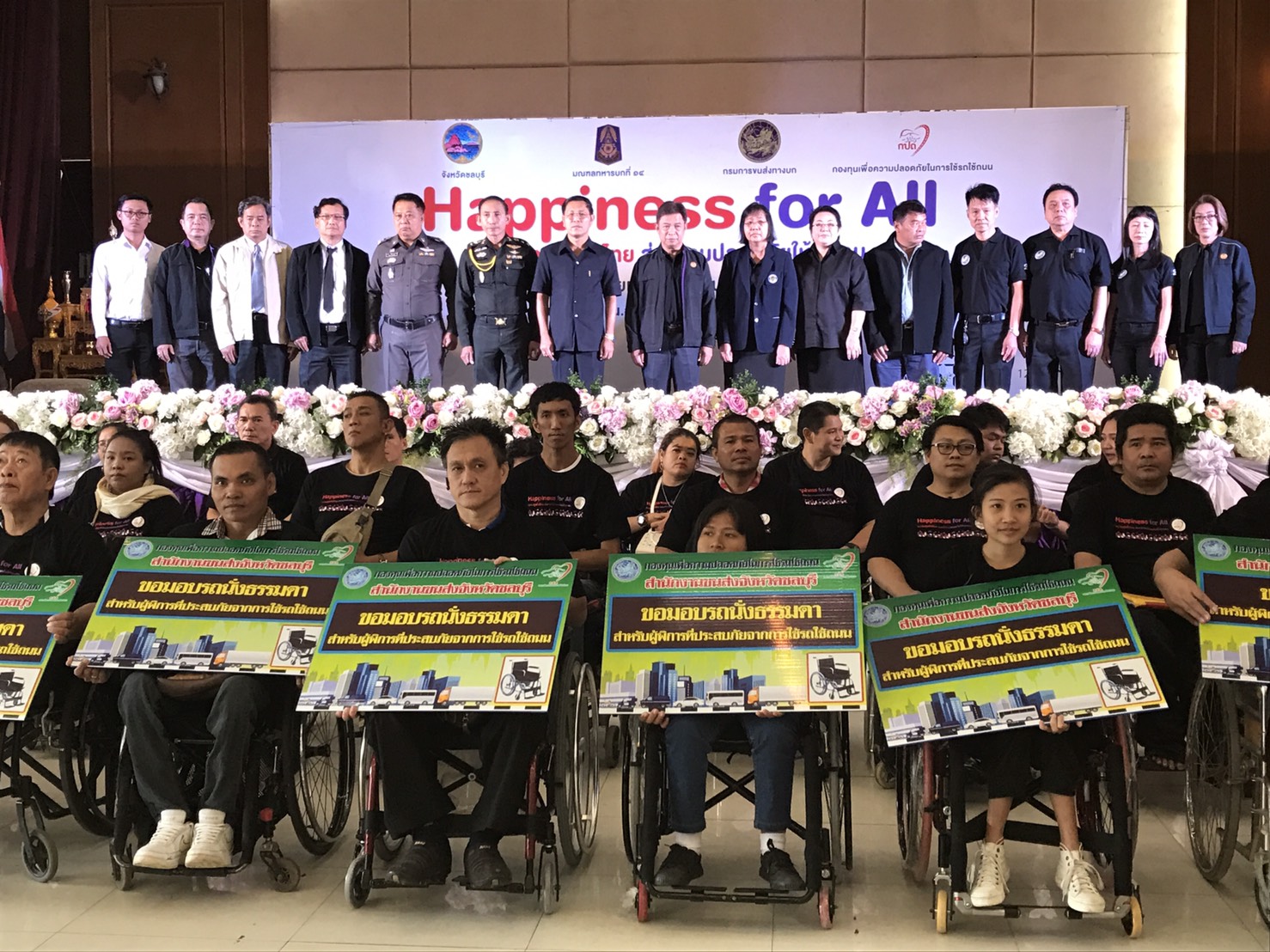 ที่อาคารกีรติสิริโยธิน ค่ายนวมินทราชินี อำเภอเมือง จังหวัดชลบุรี นายวรานนท์ ยิ้มมงคล ปลัดจังหวัดชลบุรี เป็นประธานเปิด พร้อมมอบอุปกรณ์ช่วยเหลือผู้พิการที่ประสบภัยจากการใช้รถใช้ถนน จำนวน 99 ราย เป็นเงิน 5,094,000 บาทตามโครงการ ความสุขทั่วไทยส่งความปลอดภัยให้ทุกคน