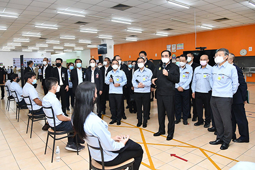วันศุกร์ที่ 17 กันยายน 2564 ที่ บริษัท มิตซูบิชิ มอเตอร์ส (ประเทศไทย) จำกัด (แหลมฉบัง) ตำบลทุ่งสุขลา อำเภอศรีราชา จังหวัดชลบุรี พล.อ.ประยุทธ์ จันทร์โอชา นายกรัฐมนตรี นายสุชาติ ชมกลิ่น รัฐมนตรีว่าการกระทรวงแรงงาน นายอิทธิพล คุณปลื้ม รัฐมนตรีว่าการกระทรวงวัฒนธรรม พร้อมด้วยคณะทำงานฯ โดยมี นายภัครธรณ์ เทียนไชย ผู้ว่าราชการจังหวัดชลบุรี นายวิทยา คุณปลื้ม นายกองค์การบริหารส่วนจังหวัดชลบุรี รวมถึงหัวหน้าส่วนราชการจังหวัดชลบุรี และหน่วยงานที่เกี่ยวข้องร่วมตรวจเยี่ยมการดำเนินโครงการนำร่องการป้องกันและการควบคุมการแพร่ระบาดในโรงงาน (Factory Sandbox) ระยะที่ 1 ในพื้นที่จังหวัดชลบุรี ซึ่งเป็นหนึ่งในจังหวัดที่มีเขตอุตสาหกรรมที่สำคัญจังหวัดหนึ่งของภาคตะวันออก โดยโครงการนี้เป็นการดำเนินการภายใต้แนวคิด “เศรษฐศาสตร์สาธารณสุข” มุ่งเน้นให้สถานประกอบการ กิจการ โรงงานภาคการผลิตส่งออกขนาดใหญ่ มีแรงงาน 500 คนขึ้นไป ที่มีความสำคัญต่อการขับเคลื่อนเศรษฐกิจของประเทศให้สามารถดำเนินการต่อไปได้ภายใต้มาตรการควบคุมและป้องกันโรคโควิด-19 |